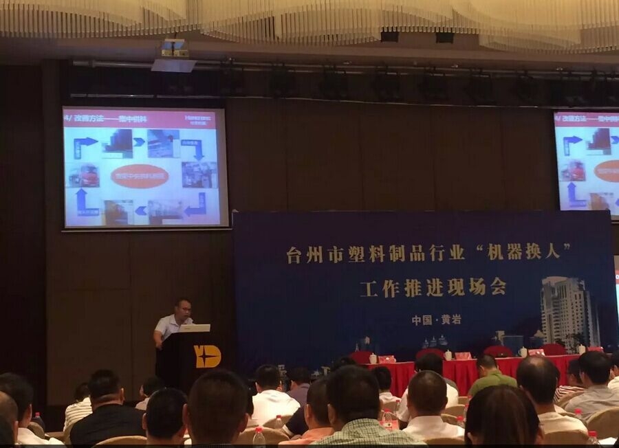 会议现场考察了星威、赛豪、纪元、永高等4家塑料行业“机器换人”示范企业,黄岩区政府在会上作了推进塑料制品行业“机器换人”典型介绍,相关重点企业,装备商做了发言,其中东莞市恒荣机械设备有限公司获邀作为装备重点企业的服务商之一做了交流发言,详细阐述《中央供料系统介绍与应用》,主要分析当前社会背景、传统注塑行业存在的问题、如何运用中央供料系统改善注塑行业面临的种种困扰及中央供料在4.0工业中的应用。
