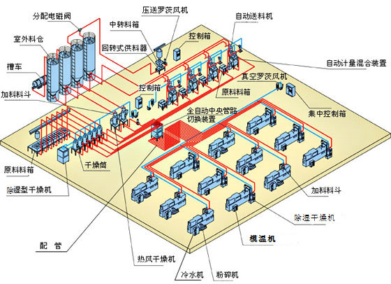 二、节能:供料系统操作简易,只需要少数的几个人即可以控制整个注塑工厂的供料需求,从而减少了大量的劳动力成本。其次、减少了在注塑机旁边的原料带及相应的辅助设备、提高了空间的利用率。此外、由于采用了集中供料的方式、相对应地减少了很多的单机设备,也就节省了电能及减少维护费用。